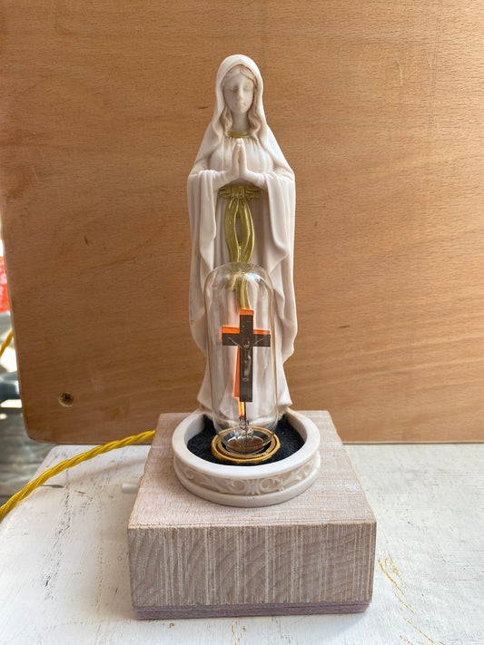 White Virgin Mary Vintage Lamp with cross shaped bulb by Lost & Foundry