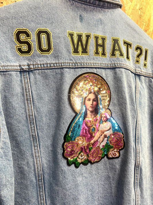 So What? Virgin Mary, Upcycled, Embriodery Denim Jacket by Relab