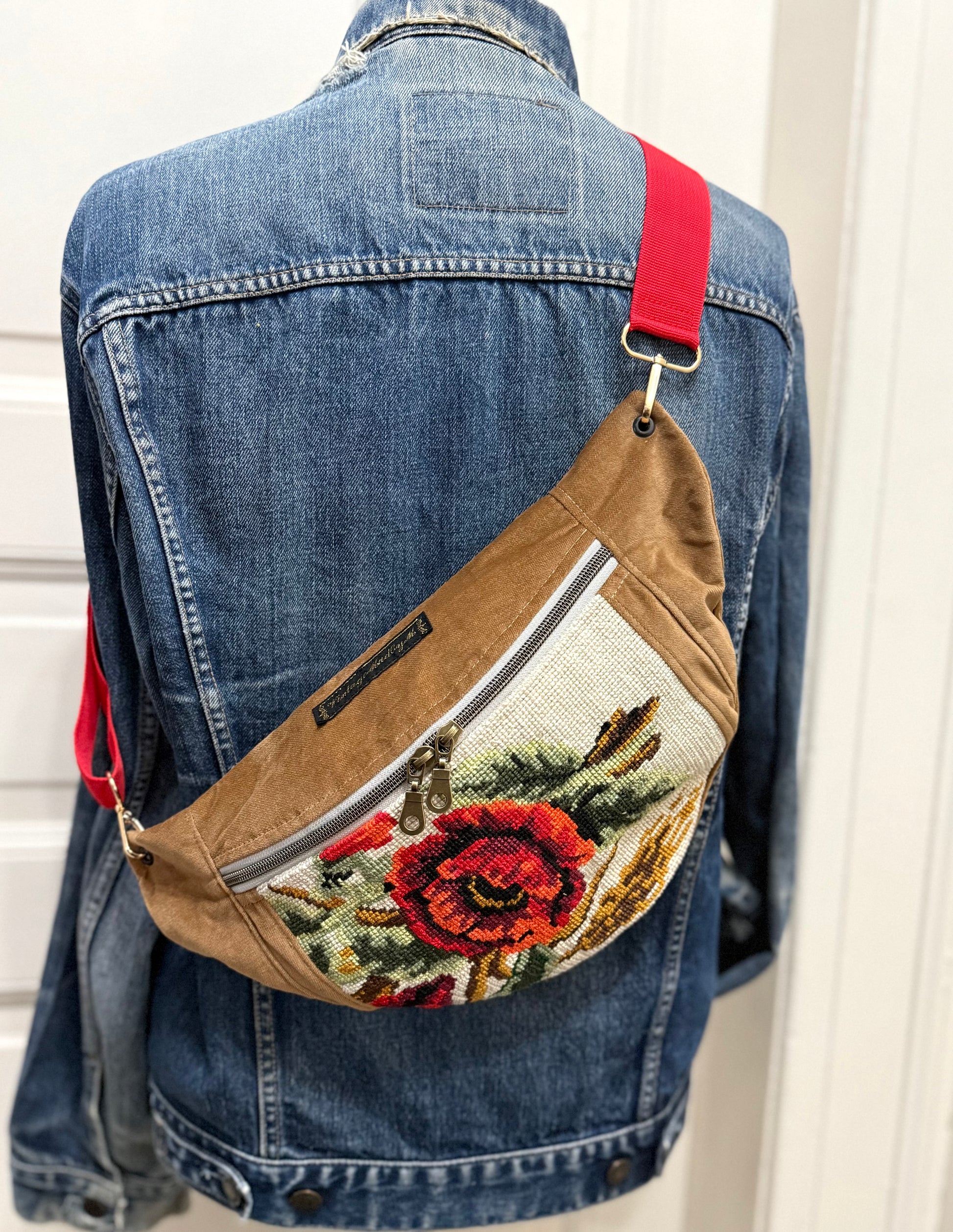 Brown velvet Vintage needlepoint design French tapestry bum bag by Vintagemadbym