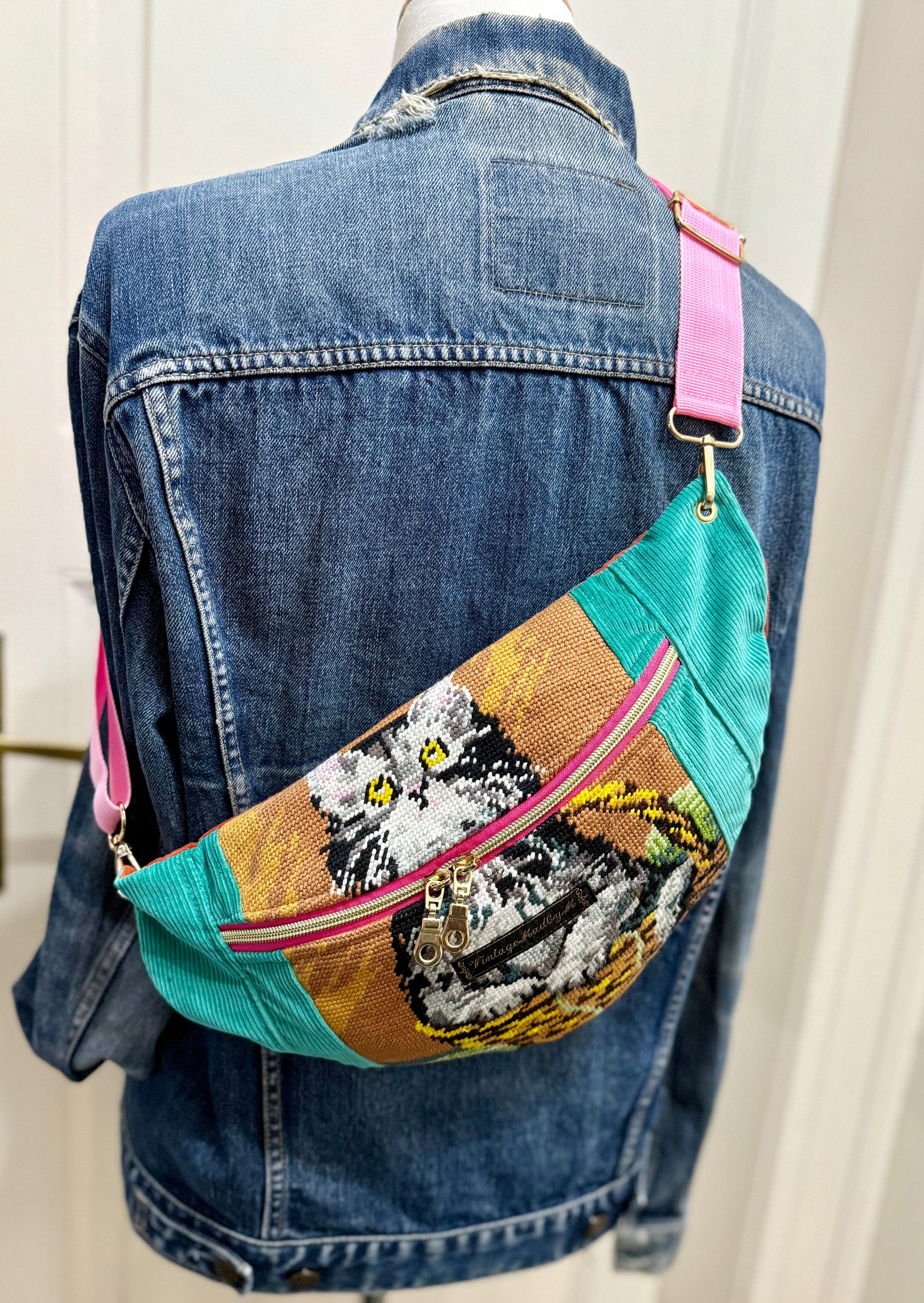 Vintage needlepoint Cat design French tapestry bum bag by Vintagemadbym