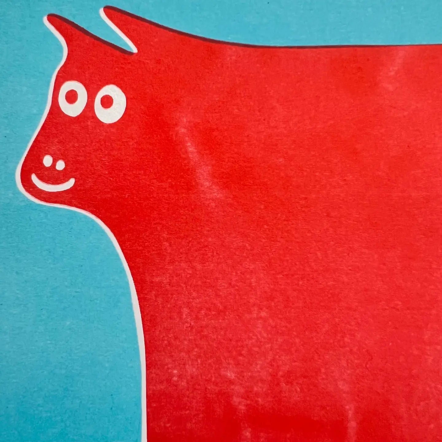 “Cow” A riso print in red and light blue ink Open Edition Please note - because there are large blocks of colour in this print - the textured nature of Riso printing is more visible. See pictures!