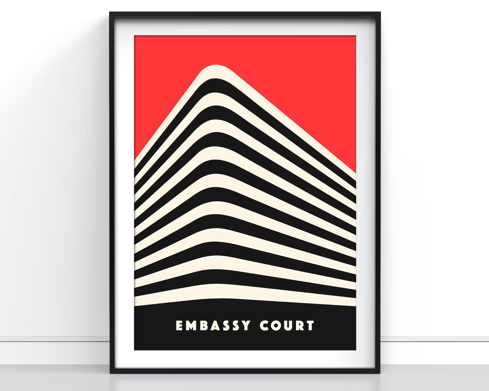 Illustrated in our plant-filled Brighton and Hove studio, this exclusive giclee print features Embassy court. A pioneering, modernist block of flats, it was completed in the mid-1930s and features the first penthouse suits in the UK. It became run down by the end of the 1990s but was saved and refurbished to its former glory in the 21st Century.