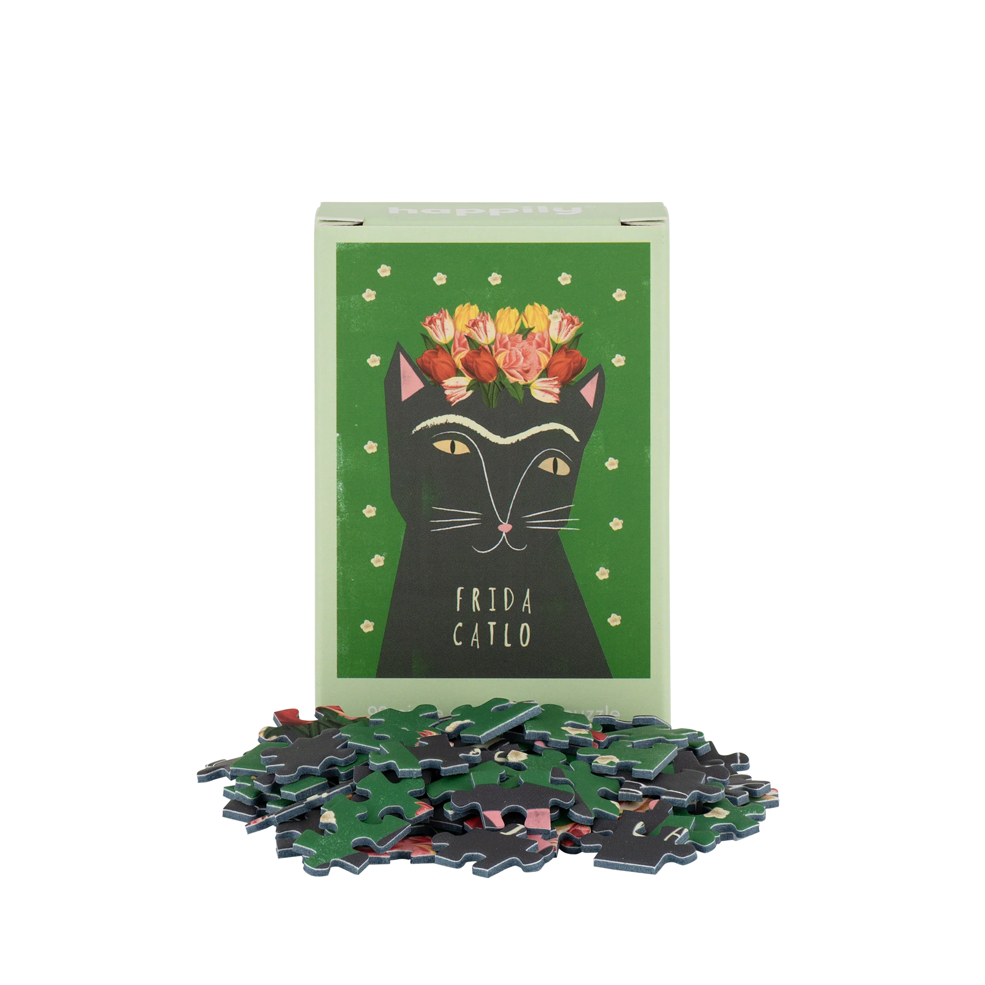 99 Piece Mini Jigsaw Puzzle featuring a fun cat illustration of Frida Kahlo by Nia Gould.