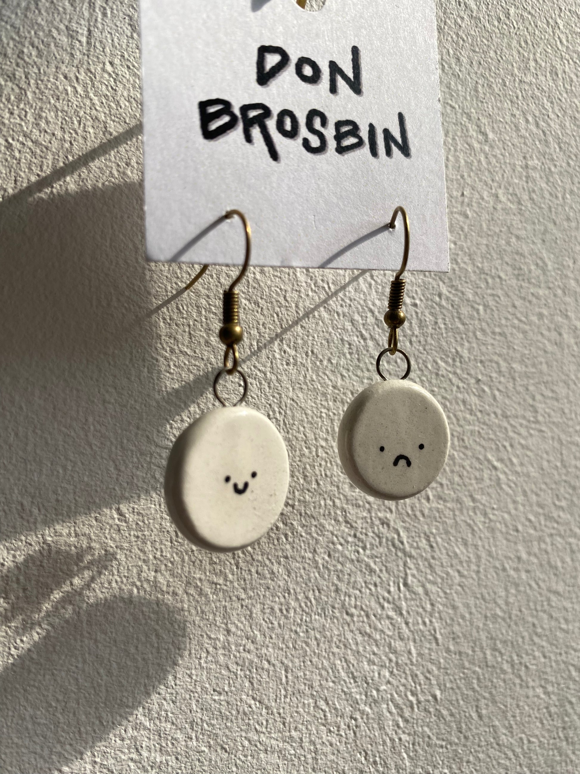 Add a touch of fun to your outfit with Don Brosbin's Happy Sad Faces handmade ceramic earrings. Each pair is uniquely crafted with playful expressions, bringing a smile (or a frown) to your face.