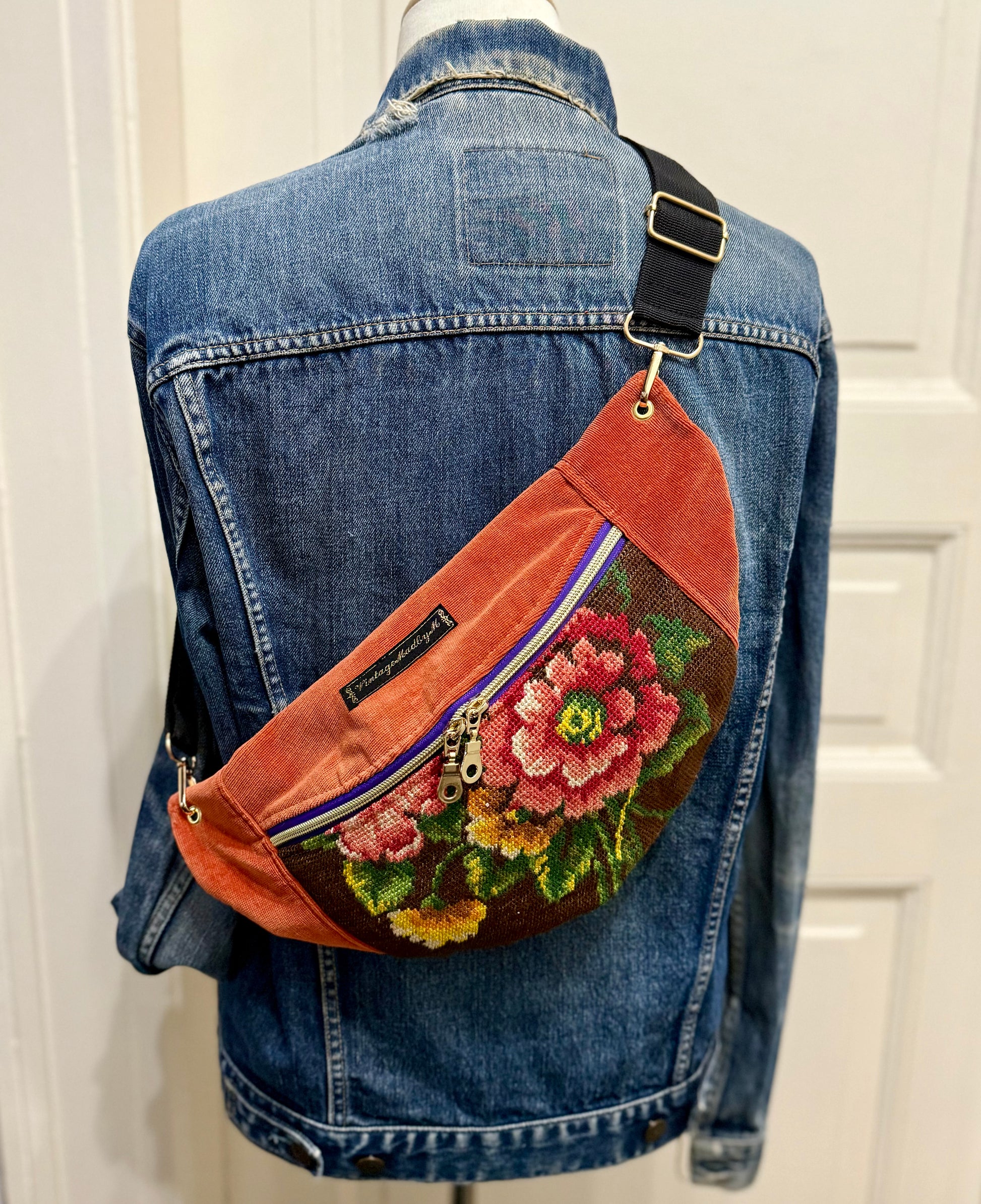 Orange velvet Vintage needlepoint design French tapestry bum bag by Vintagemadbym