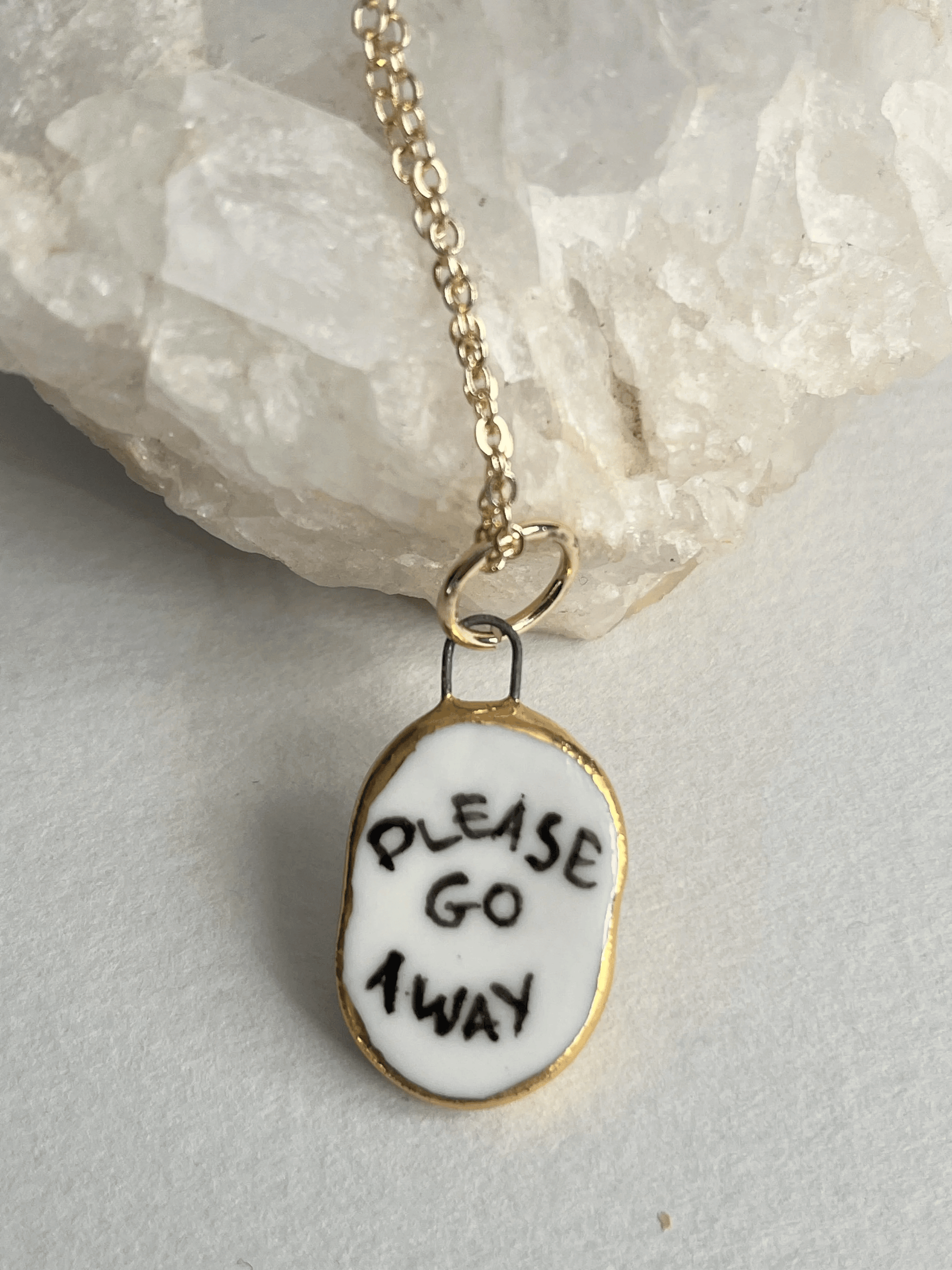 Porcelain oval "Please go Away" pendants with gold rim by REBECCA EDELMANN Ceramics
