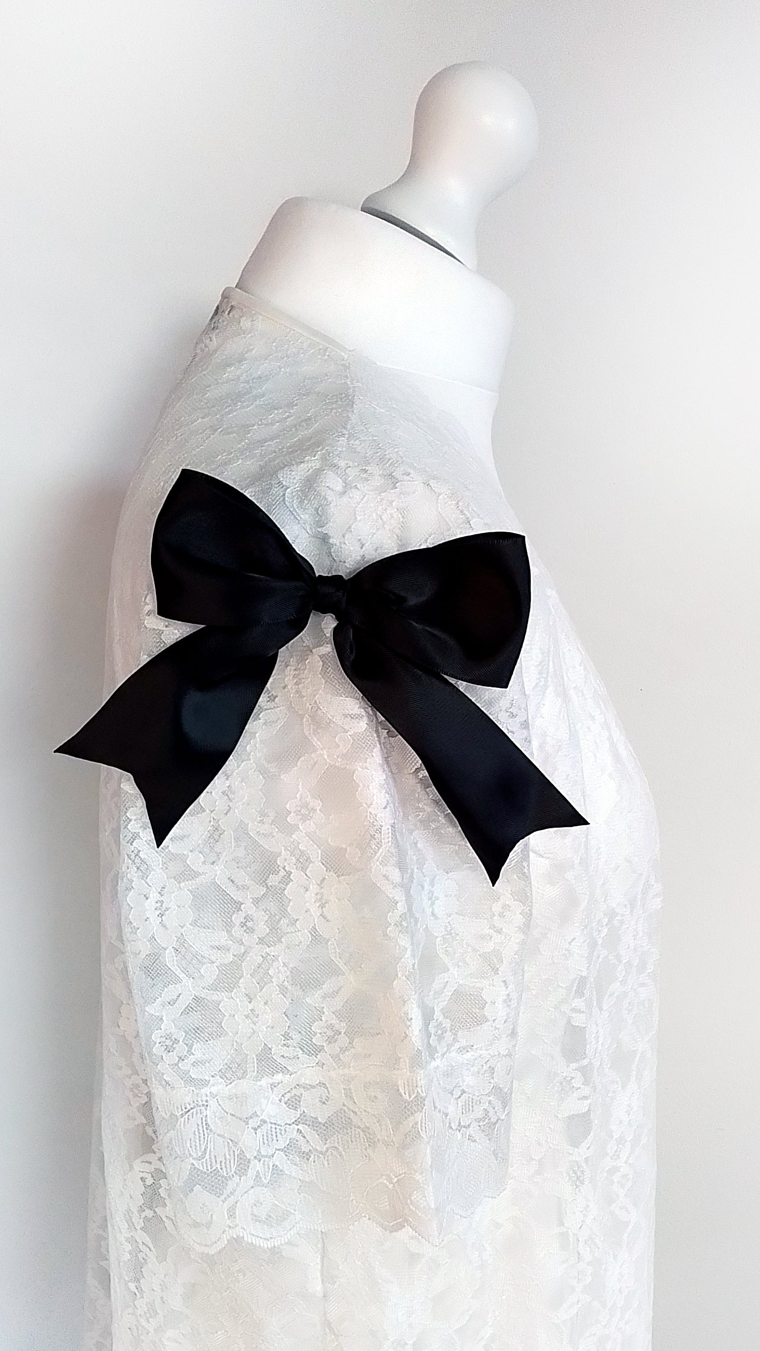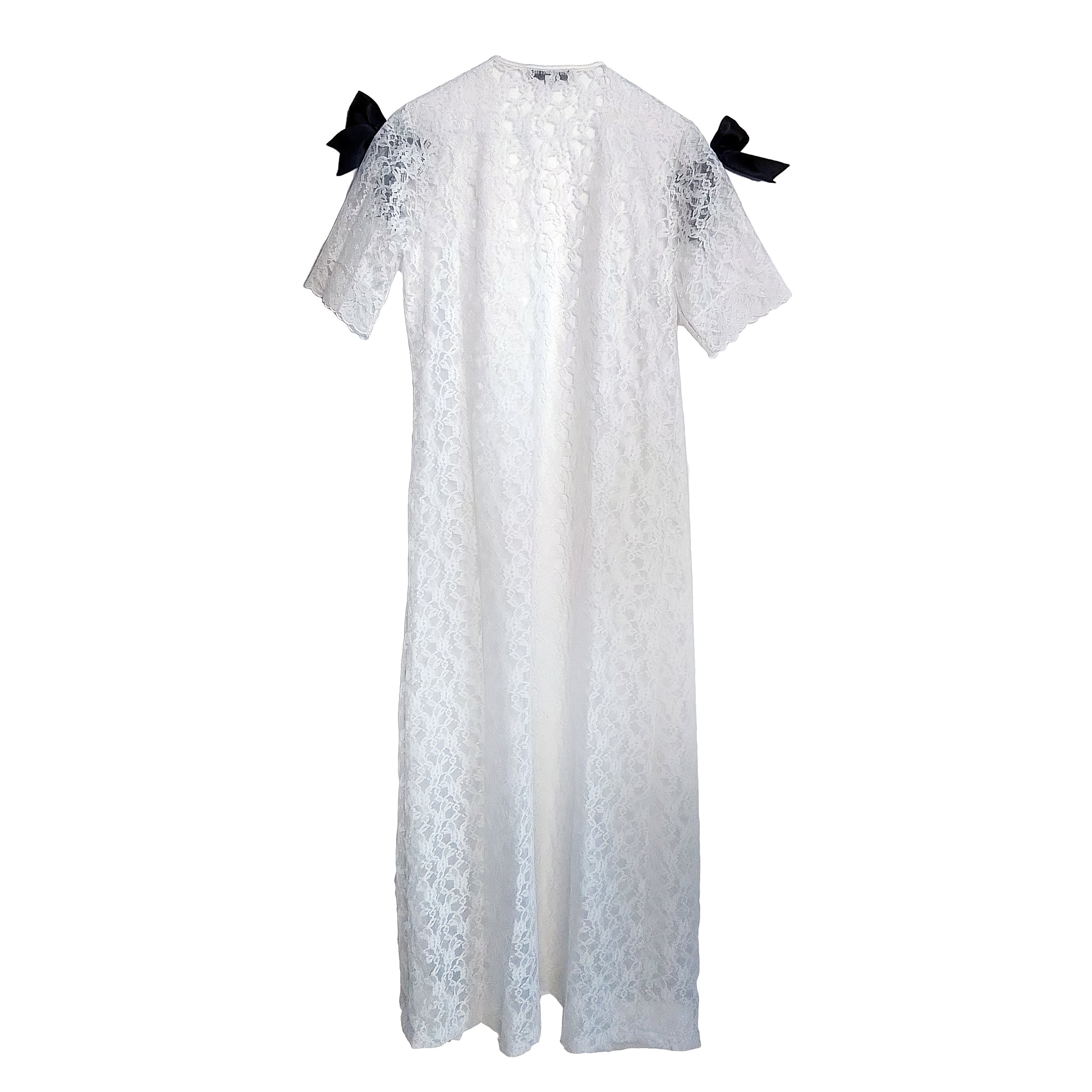 Add a touch of dreaminess to any outfit with this precious vintage white lace robe, adorned with black satin maxi bows.