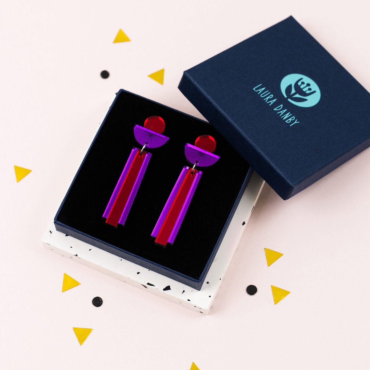 Handmade in a fan shape from layered, mirrored acrylic in red and purple. Lightweight to wear, they look super stylish and are the ultimate festival earrings or party earrings!