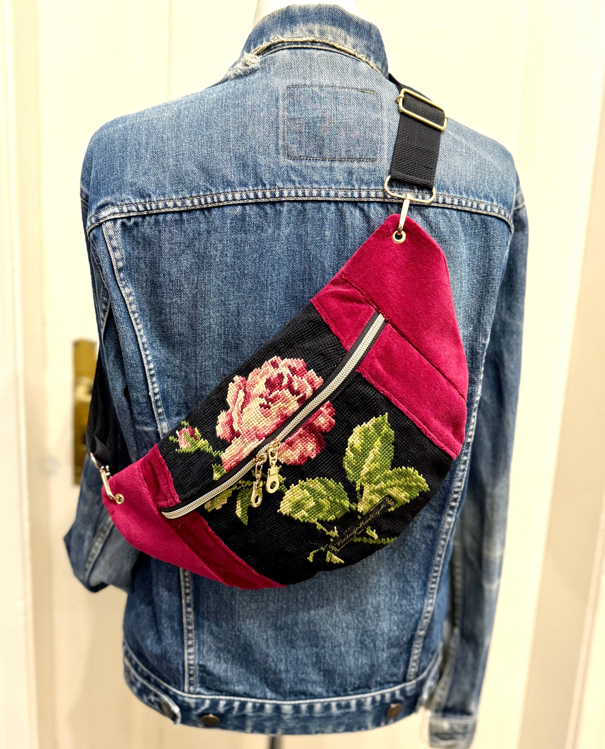 Velvet Pink Vintage needlepoint design French tapestry bum bag by Vintagemadbym